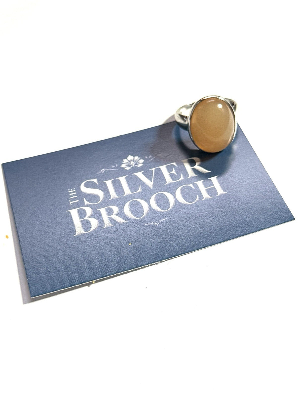 This Pretty Peach Moonstone Silver Ring in size T features an oval-shaped main stone measuring 15mm in width and 20mm in length, set in sterling silver with a bezel setting. The band width is 5mm, and the piece is crafted with 925 metal purity. The elegant design showcases a single gemstone, making it a stylish and unique accessory for any jewellery lover. Perfect for adding a touch of glamour to any outfit, this ring is a beautiful choice for those who appreciate fine jewellery.