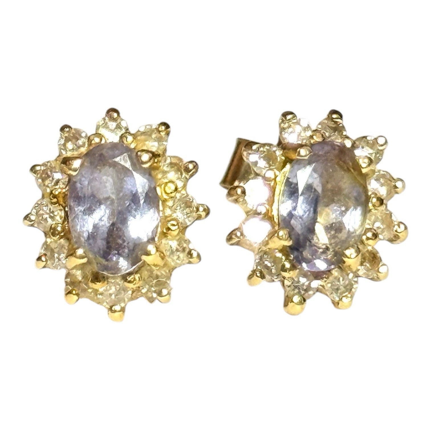 These stunning Tanzanite & Diamond Halo 18ct Gold Earrings feature beautiful oval-shaped Tanzanite's as the main stones, each surrounded by 12 sparkling diamonds. The earrings are set in 18ct yellow gold with a prong setting, giving them a luxurious and elegant look. With a total carat weight of 1.24ct, these stud earrings are perfect for adding a touch of glamour to any outfit, making them a perfect choice for those who appreciate fine jewellery. RRP Approx. £1400