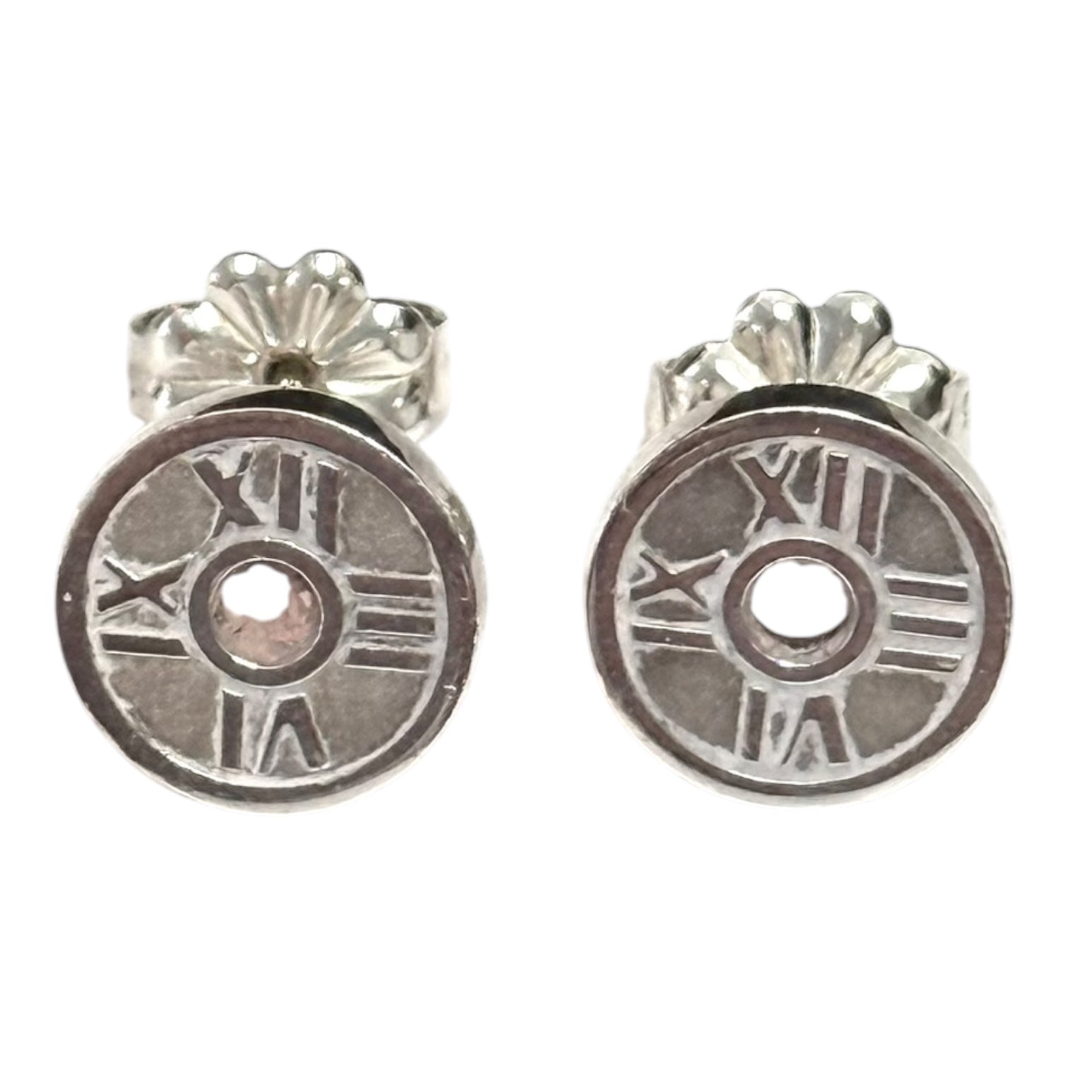 These Tiffany & Co 925 Silver Atlas Earrings are an authentic and rare piece of fine jewellery. Made from sterling silver with a purity of 925, these round stud earrings feature a Roman numeral theme design. Certified as guaranteed authentic, they are a stylish addition to any earlobe, perfect for those who appreciate high-quality craftsmanship and timeless elegance.